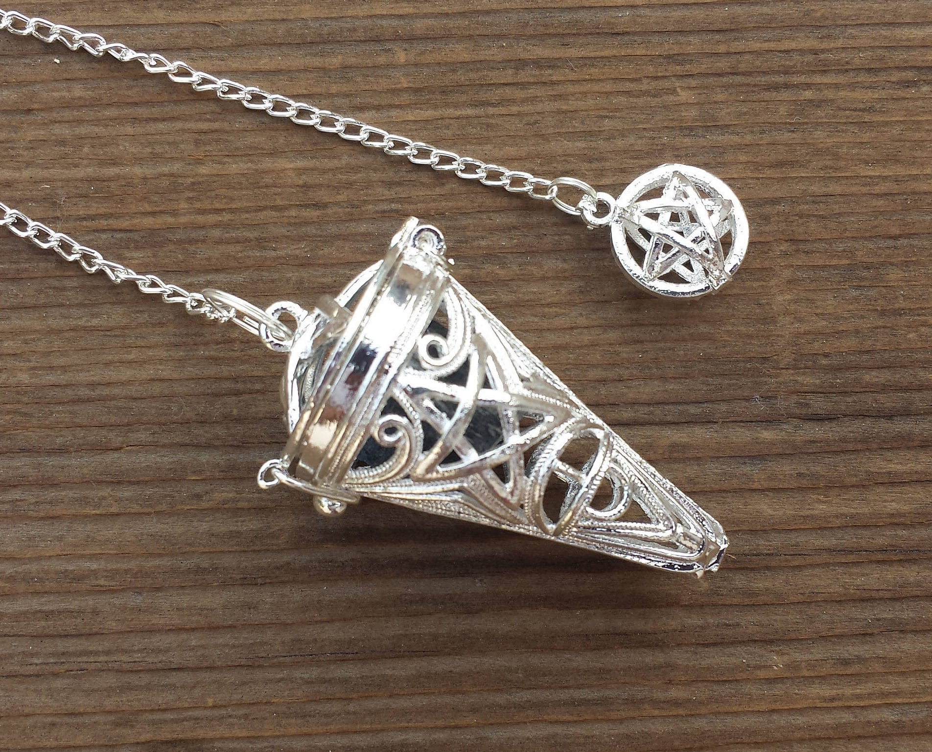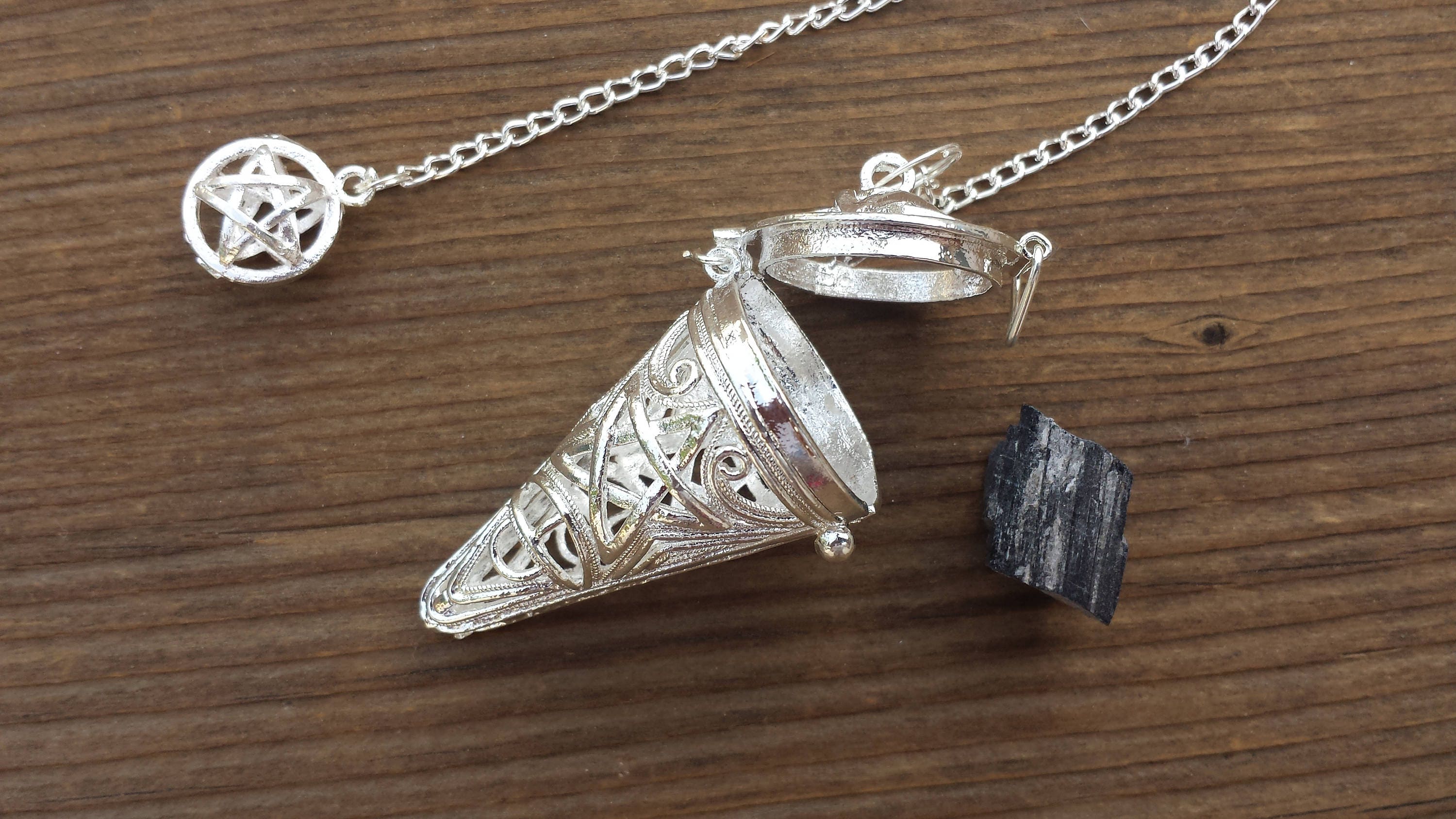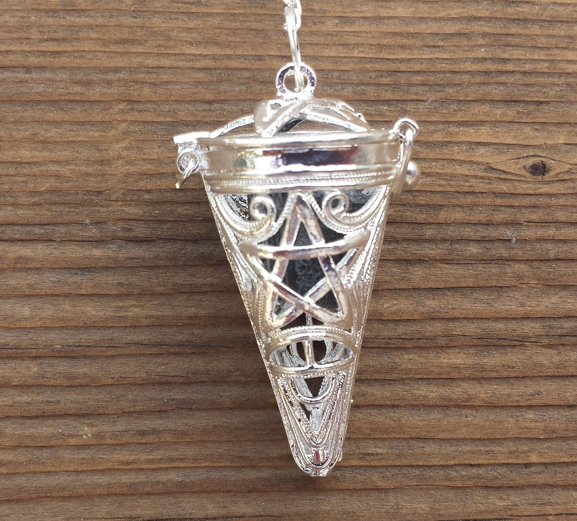 This pendulum can be opened up and any stone or item can be placed inside. A piece of selenite is included with this pendulum.