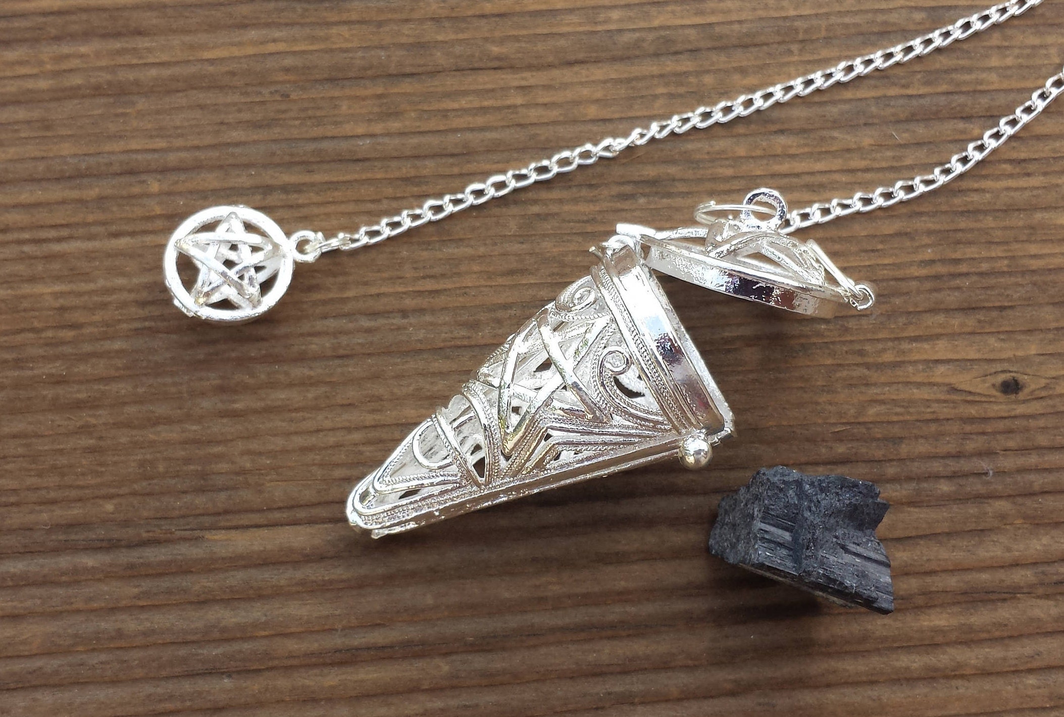 PENTACLE CAGE GEMSTONE PENDULUM WITH A PIECE OF BLACK TOURMALINE INCLUDED
